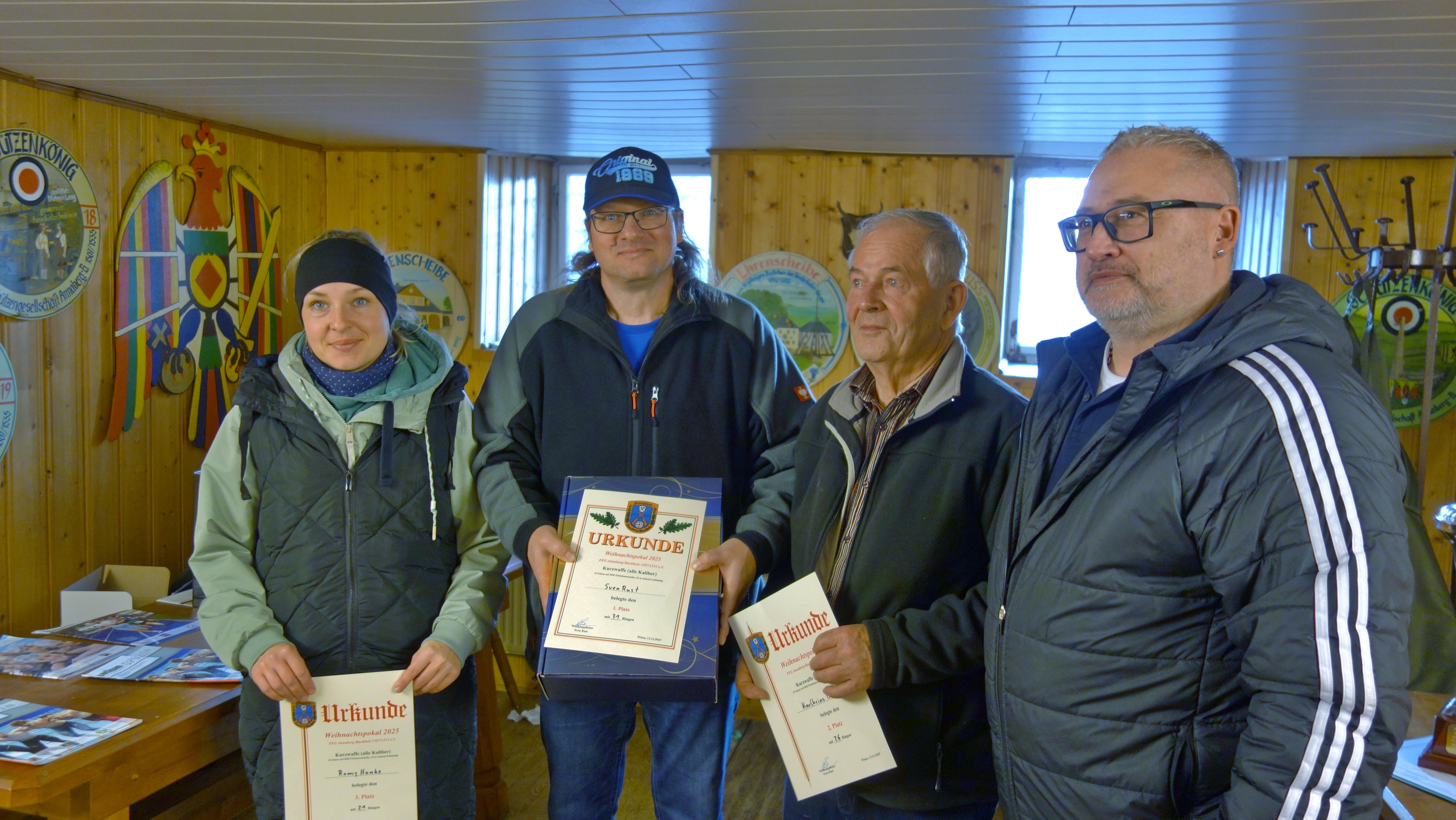 Weihnachtsgans und -pokalschießen Disziplin Gans: 1 Schuß KK-Gewehr auf 50 Meter auf abgedeckter Scheibe Disziplin Pokal: Kurzwaffen aller Kaliber (10 Schuss) Gedächtnispokal (Wanderpokal) Disziplin: 50m, 5 Schuss mit Kalaschnikow (Waffe und Munition werden zur Verfügung gestellt) anschließend Weihnachtsfeier Wettkampfleiter: Burkhard Koehn, Sven Rust